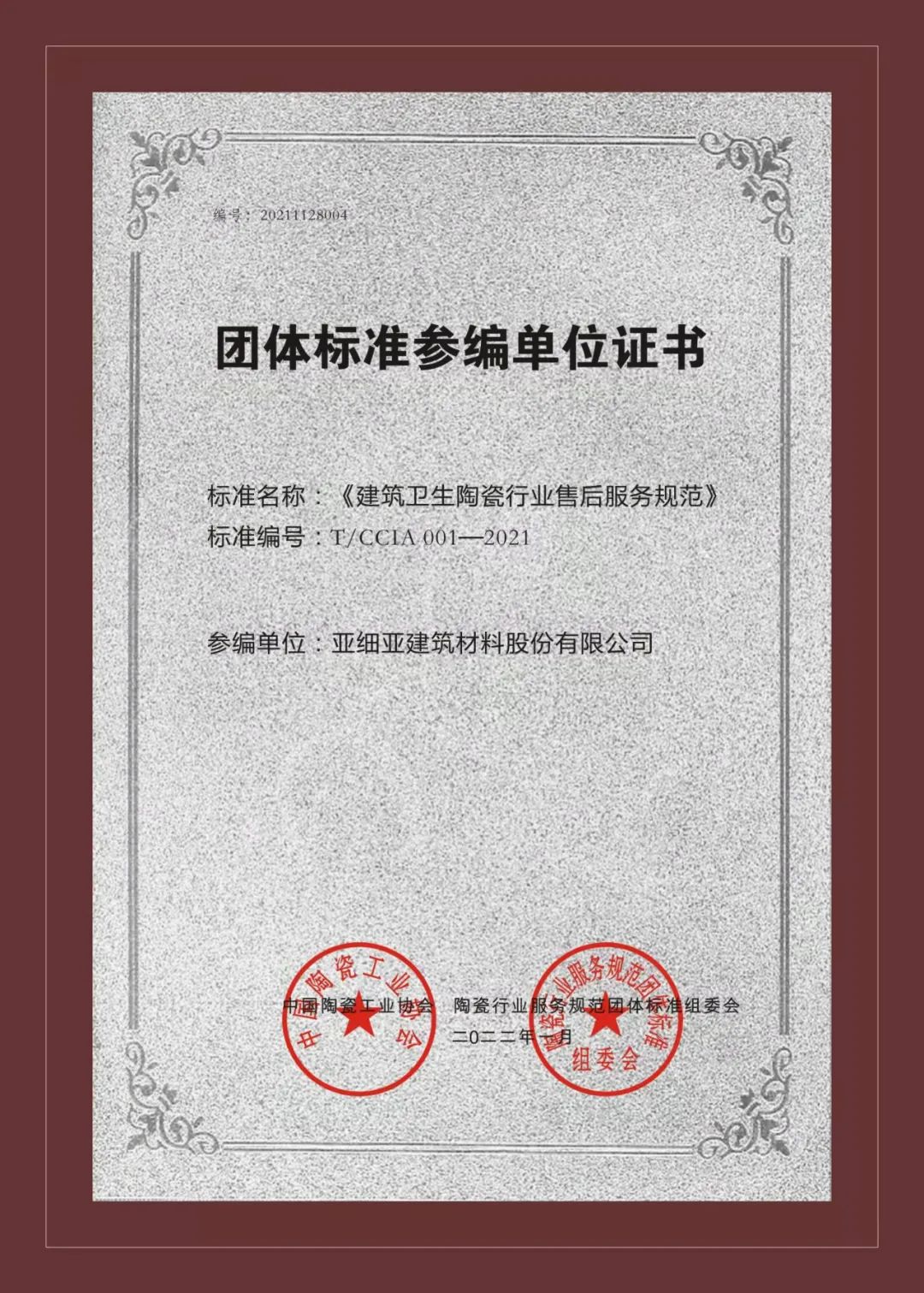 亞細(xì)亞瓷磚作為建筑衛(wèi)生陶瓷行業(yè)售后服務(wù)規(guī)范團(tuán)隊(duì)標(biāo)準(zhǔn)起草單位之一,被授予《建筑衛(wèi)生陶瓷行業(yè)售后服務(wù)規(guī)范》團(tuán)體標(biāo)準(zhǔn)參編單位證書(shū)。
